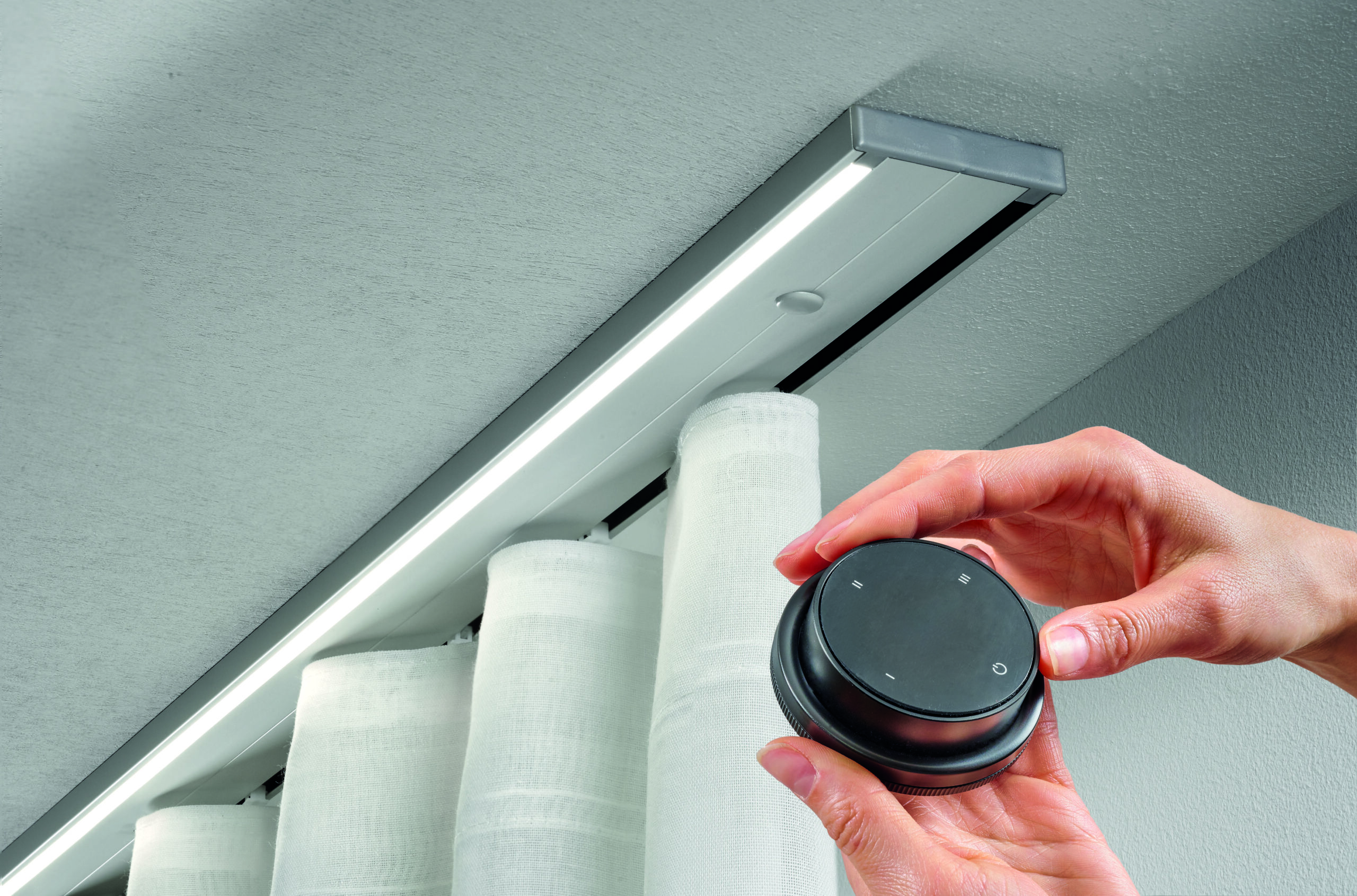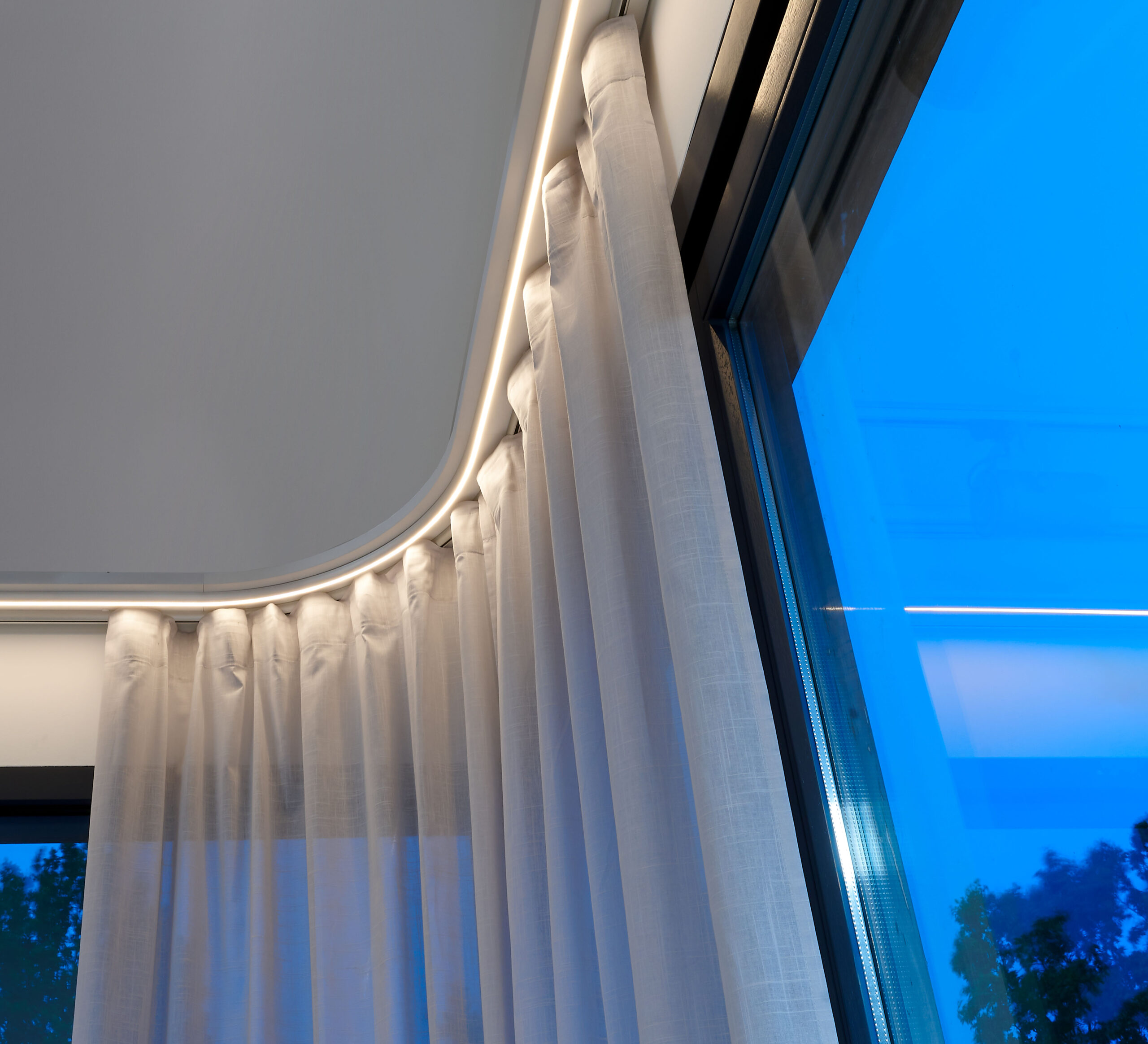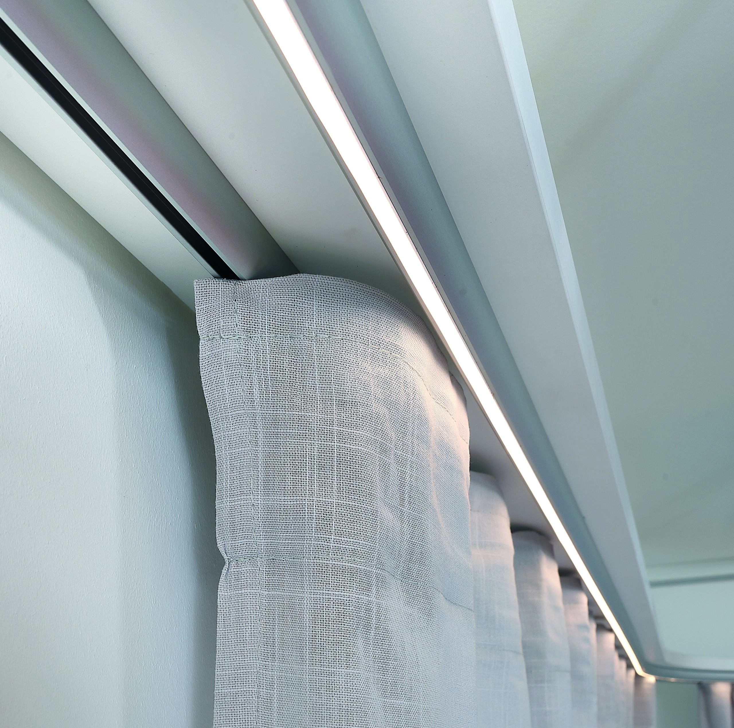 Bei 2- und mehrläufigen Systemen laufen LED-Band und Stoff in derselben Schiene. Das schafft eine ruhige, klare Linienführung und erfordert keine zusätzlichen Lichtinstallationen im Raum.